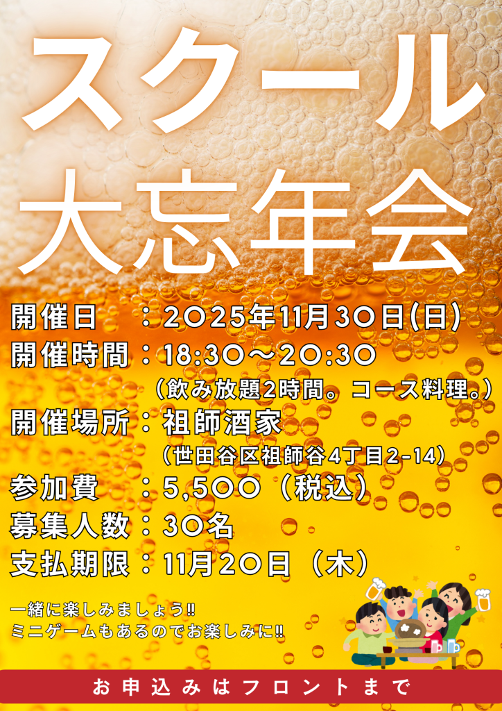トップページ > ニュース > イベント募集 > スクールイベント募集 > 11/30(日)スクール大忘年会開催致します‼